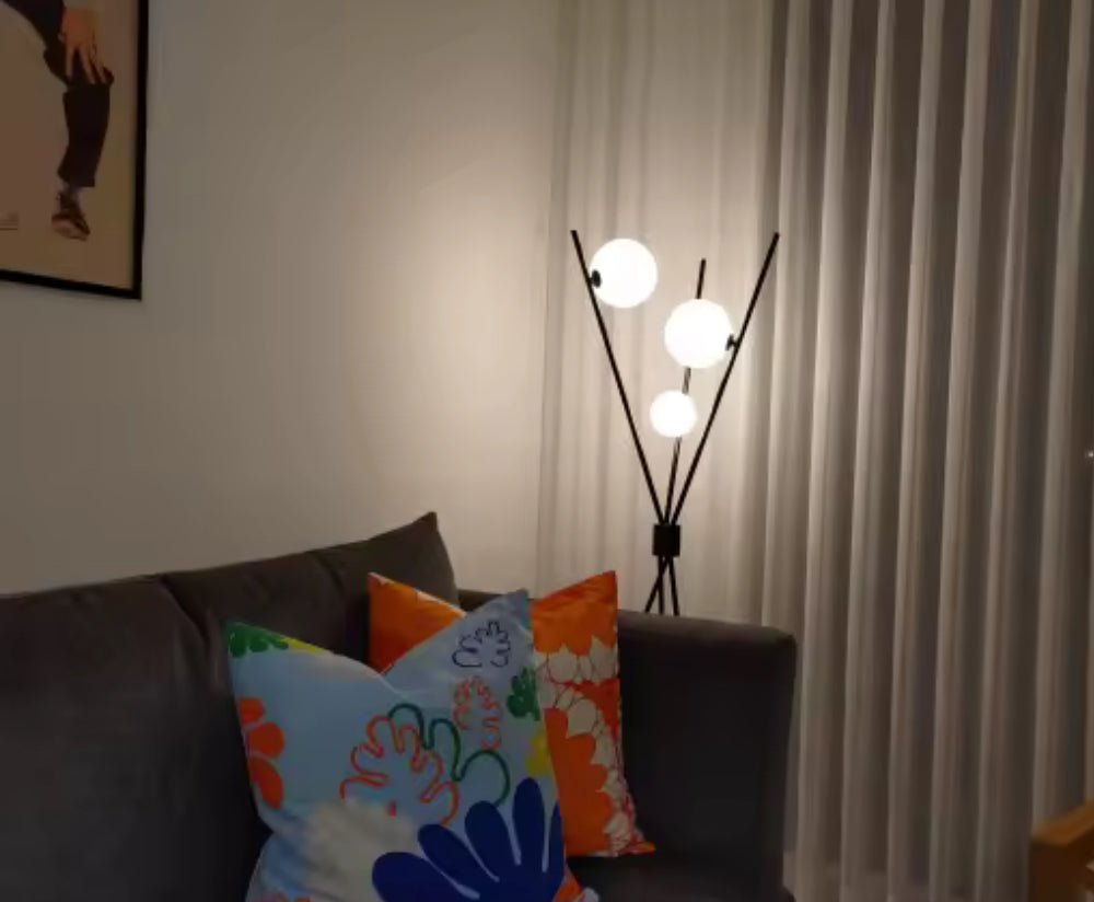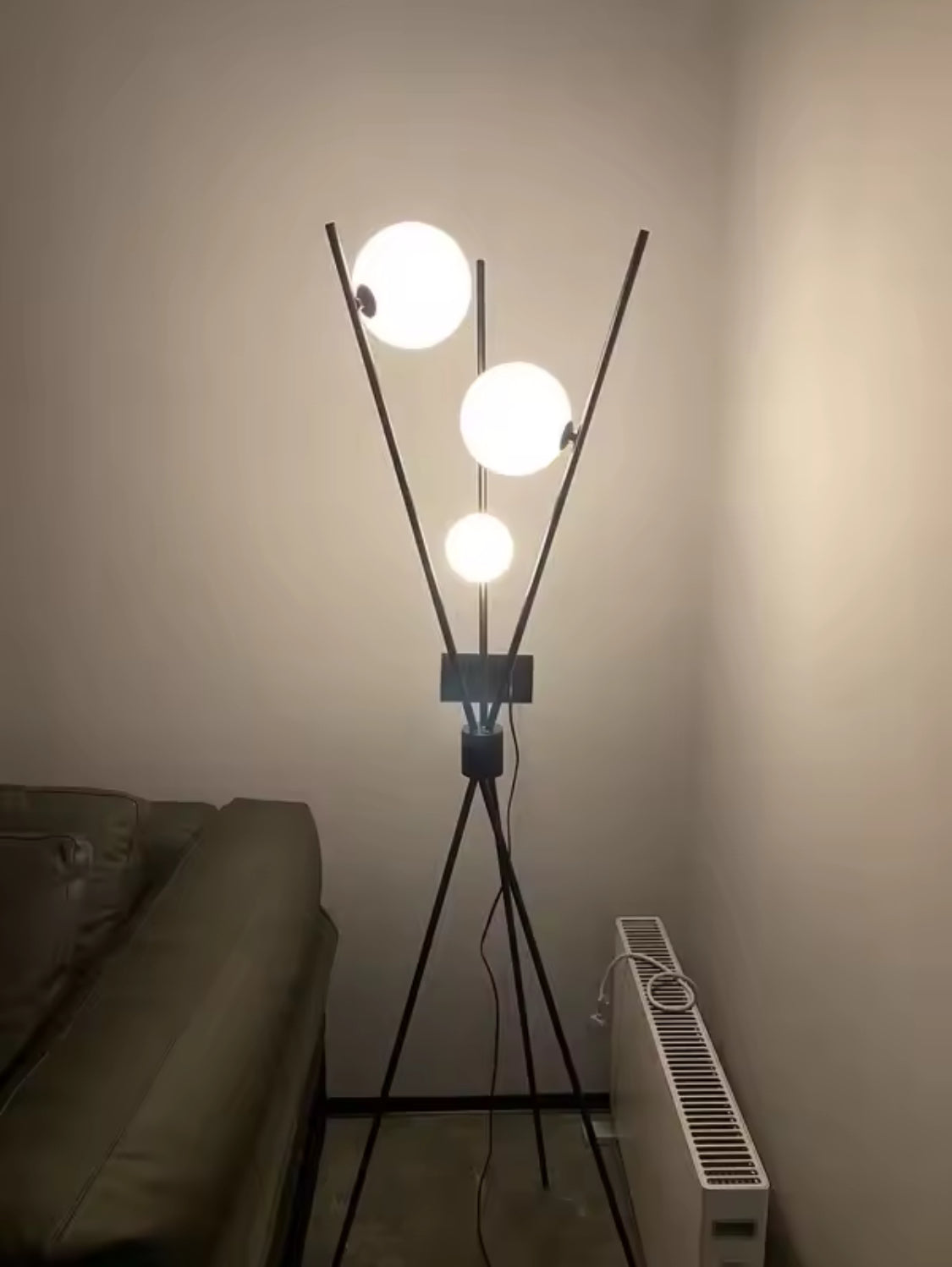 This modern floor lamp features a slim black metal frame. It is equipped with three white globe lights arranged at different heights, providing a soft and warm glow. Elegant and minimalist, it fits perfectly in a contemporary living room or bedroom.